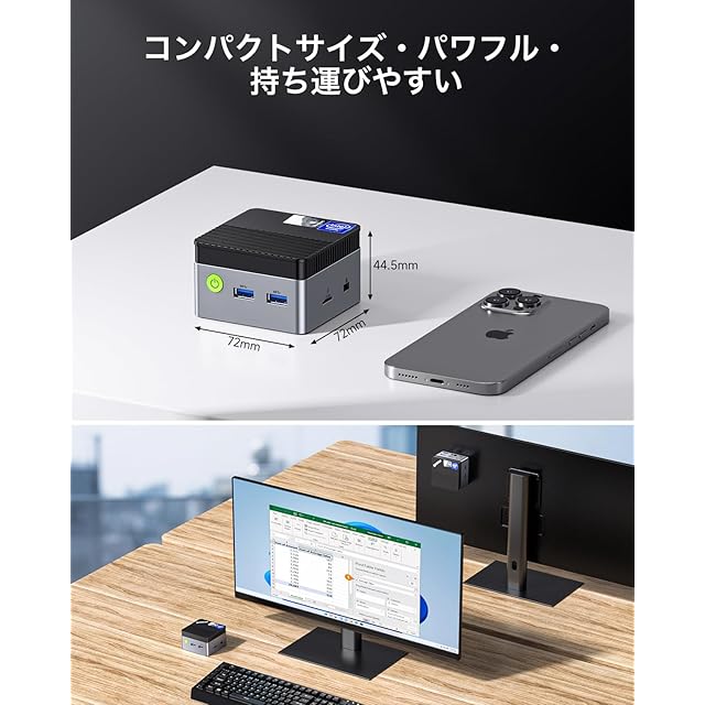 【手のひらサイズの超コンパクト設計・省電力な小型PC】小さいボディー、フルパワーのG5は超ミニのサイズ(7.2*7.2*4.5cm)で、従来のミニpcよりも半分小さくなります。*重量もわずか164gがあり、デスクトップより持ち運び・引っ越しが非常に楽です。筐体が小さいで、奥行きが少ないデスクの上でも設置場所を確保できます。また消費電力は僅か12wなので、電気代も大幅に削減します。