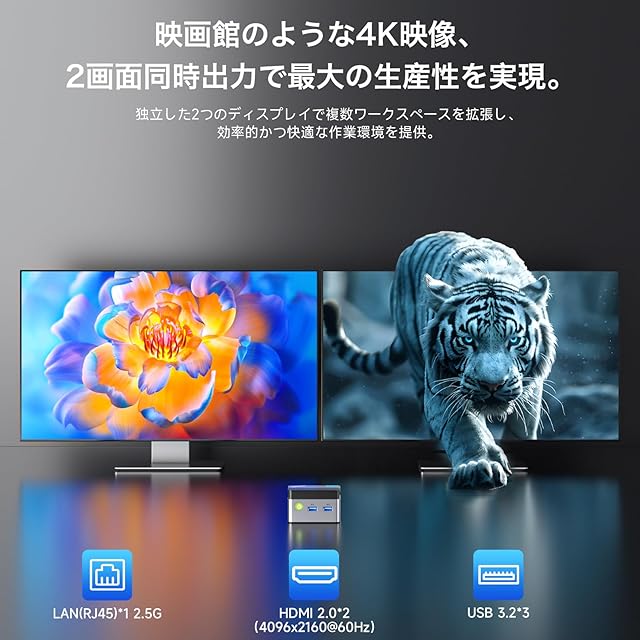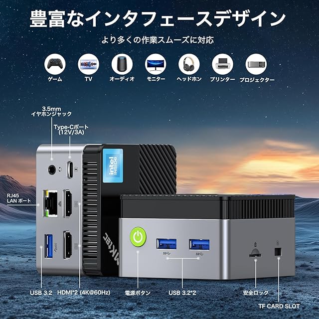 【豊富な接続端子・2画面同時出力】ミニpcにはUSB3.2*3 / HDMI2.0*2 / Giga LAN(RJ45)*1 1000M / 3.5mmイヤホンジャック*1 / TFカードスロット(最大128GB)*1 / TYPE-C(12V/3A)*1 豊富なインターフェイスあります。2台のモニターをデスクトップpcに4K@60Hz画質で同時に出力することができます。1000MLANポートはより安定で高速なネットワーク環境をサポートでき、LAN越しのファイル転送を高速に行なえるのも大きな特徴であり、遅延なくて流暢なインターネットサーフィンやビデオ会議やゲームなどを楽しめます。