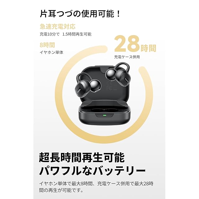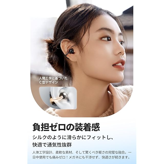 【耳を塞がない新次元デザイン】ワイヤレスイヤーカフイヤホンならではのオープンイヤー構造。眼鏡/帽子/髪型と干渉せず、耳道圧迫ゼロの快適装着を実現。形状記憶合金採用で耳に自然にフィットし、通勤/オフィス/家事中の長時間使用でも全く疲れません。IPX5防水仕様で汗や突然の雨も安心。