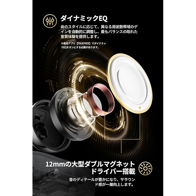 【12mmデュアルマグネット&空間オーディオ】大口径バイオダイアフラムが奏でる躍動感ある低音と、デュアルマグネット駆動のクリアな高音。専用アプリ連動で360°立体的なサウンドステージを構築。ダイナミックEQが楽曲ジャンルに応じて最適な音質を自動調整。