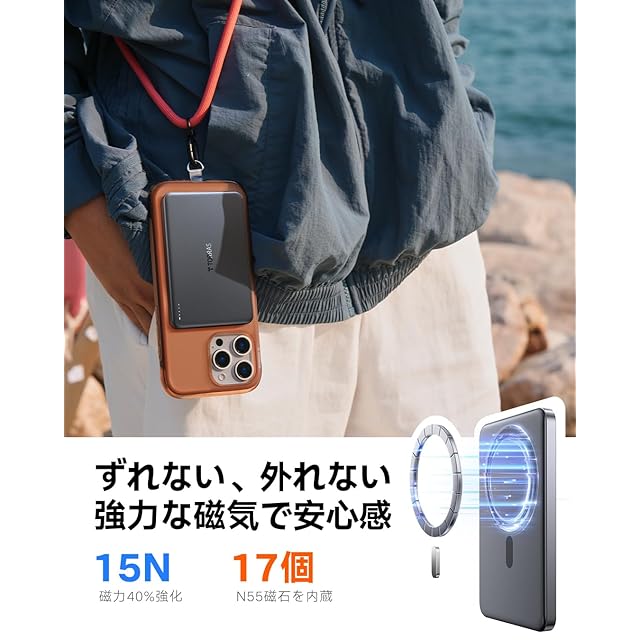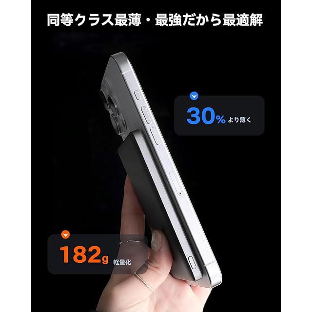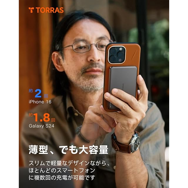 【同等クラス最薄・最強だから最適解】モバイルバッテリー探しで迷ったらTORRASが選択。10000mAhのmagsafe対応モバイルバッテリーの中で極限まで薄く設計された。約14mmだけを実現。掌サイズなのでスマホにくっつけた状態で握ればそれほど負担に感じません。携帯性のバランスが取れた容量が、iPhone 16に約2回以上充電できます。1泊2日程度の旅行や出張や日帰り登山の際に活躍します。