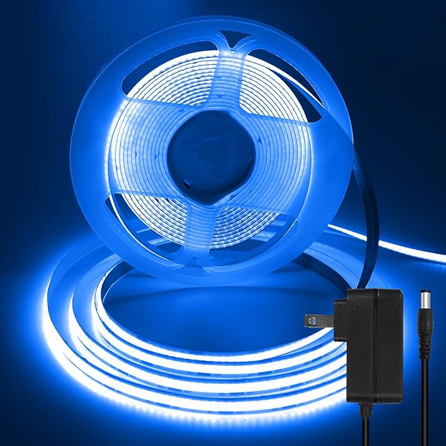 Shineburky 12V Cob LEDストリップ ブルー 5m LEDストリップ 調光機能付き LEDライトストリップ テレビのバックライト キッチン 寝室の装飾用 (電源を含む)