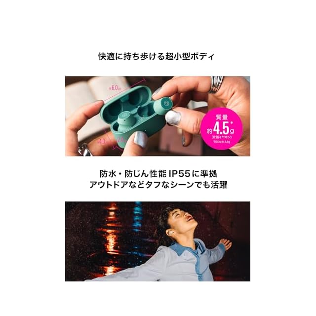 置き忘れアラートとIP55相当の防水・防じん性能:Bluetooth接続の電波が弱くなっていることを知らせる「置き忘れアラート」を ONにすると、接続が途切れる前にイヤホンから離れていることに気付くことができます。JIS 保護等級:IP55 相当(イヤホンのみ)*。日常のさまざまなシーンでイヤホンが使える高い防水性能と、砂ぼこりなどの環境下でも使える防じん性能を採用。