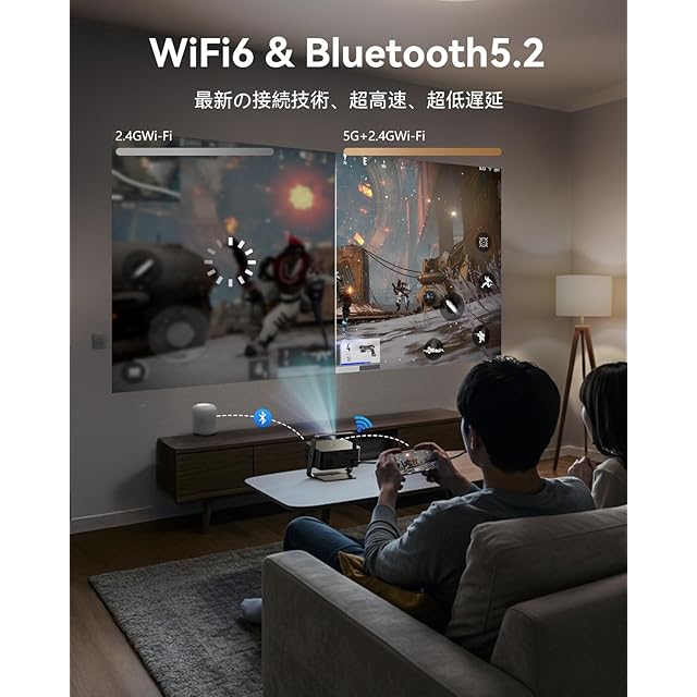 [超高速WiFi 6&双方向Bluetooth 5.2] 超高速WiFi 6接続により、スムーズな動画再生と遅延のないゲーム体験を実現します。さらに、このぷろじえくたー 家庭用はブルートゥース機能を搭載しており、ヘッドフォンやスピーカー、コンピューターなどに簡単に接続できる。このポータブルプロジェクターは、ドルビーアトモスとドルビーデジタルオーディオにも対応しています。 ドルビーサウンドスピーカーと併用することで、まるで映画の中にいるような臨場感あふれるシネマクオリティを体験できます。
