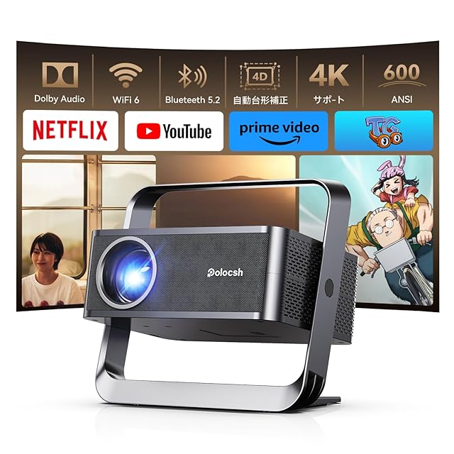 【1080P FHD・Netflix公式ライセンス】Polocsh プロジェクター 家庭用 600ANSI 4K対応 フル 天井投影プロジェクター 搭載自動台形補正 WiFi 6 Bluetooth 5.2 HiFiスピーカー電動フォーカス 短距離投影 - スタンド一体型ホームプロジェクター
