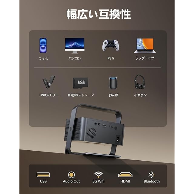 [持ち運び便利&生涯保] この小型プロジェクター 、わずか0.7kgの軽量設計で、コンパクトかつ持ち運びが簡単なため、屋内外を問わず気軽に使用できます。自宅でのゲームプレイやキャンプでの映画鑑賞など、さまざまなシーンに最適です。小型ながらも、大画面の迫力ある映像体験を楽しめます。また、HDMI、USB、3.5mmオーディオ端子など複数の入力ポートを備えており、PC、DVDプレーヤー、ゲーム機などと高い互換性を持っています。高品質な製品をお届けするため、ご購入日から1年間の無料交換および生涯を提供しています。すべての製品は、お客様にお届けする前に厳格な品質チェックを実施しております。