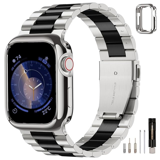 商品名:コンパチブル アップルウォッチ バンド 46mm 45mm 44mm 42mm 41mm 40mm 38mm ステンレス 男女兼用 コンパチブル apple watch バンド メンズ 保護ケース付き ビジネス交換ベルト 調整器具 iWatch Series10/9/8/SE/SE2/7/6/5/4/3/2/1に対応(シルバー/ブラック,38/40/41mm)