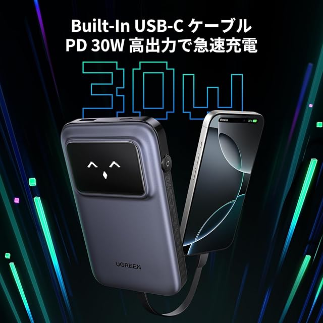 【★ 持ち運び便利で個性を際立たせる ★】30W急速充電対応の一体型ケーブルを内蔵しながらもコンパクト設計で、バッグに入れても手に持っても邪魔になりません。高級感ある質感のボディと個性的なディスプレイが、他にはないあなたらしさをアピール。移動中の充電ストレスを解消するだけでなく、おしゃれなガジェットとしても存在感を発揮します。