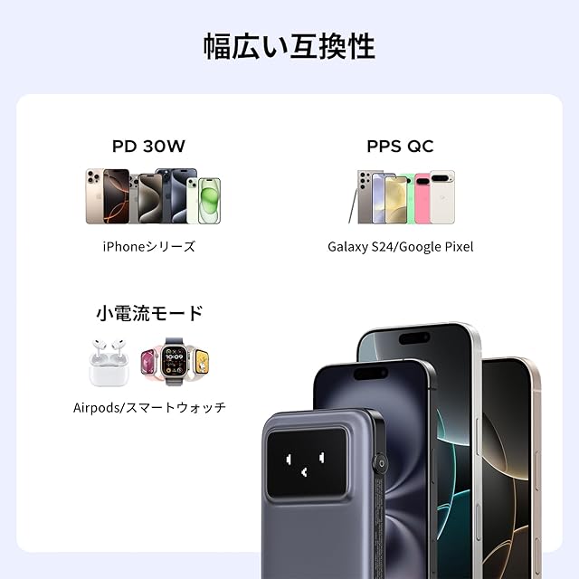 【★ iPhoneシリーズにも急速充電・PD 30W高出力対応 ★】PD 30W高出力により、iPhoneシリーズに急速充電対応します。PD対応しながら、PPS、QC4+、QC3.0、UFCS(33W)、AFC、FCP、SCPなど、あらゆる急速充電プロトコルにも対応し、ios端末やAndroid端末など持っているデバイスが幅広く充電します。一体型ケーブルは出力だけでなく、入力もPD 30Wに対応し、30W出力のUSB-C急速充電器と併用すれば約2時間でバッテリー本体に急速充電が可能です。