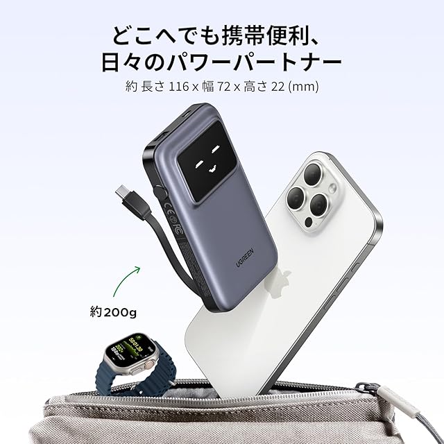 【★ USB-Cケーブル一体型・ケーブルを別途用意必要なし ★】USB-Cケーブル一体型モバイルバッテリーで、外出先でもお使いの機器をいつでも充電可能になり、ケーブルを別途持って行かなくてよいのはもちろん、ケーブルを忘れる心配がないのもメリット。荷物を減らしたい方におすすめできるモバイルバッテリーです。(※ 当製品はiphoneシリーズと互換性があり、他のブランドの携帯電話は互換性がないかもしれないことにご注意ください。ご購入前に、ご自身のスマホの仕様にご事前に確認ください。)