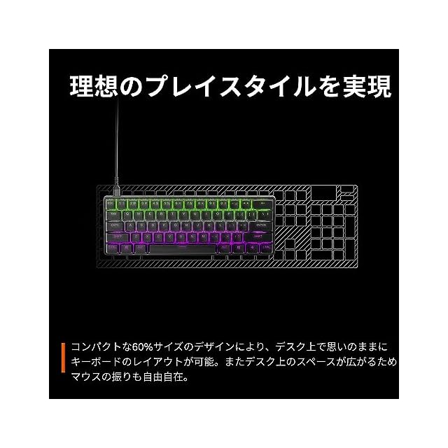 【理想のプレイスタイルを実現】コンパクトな60%サイズのデザインにより、デスク上で思いのままにキーボードのレイアウトが可能。またデスク上のスペースが広がるため、マウスの振りも自由自在。