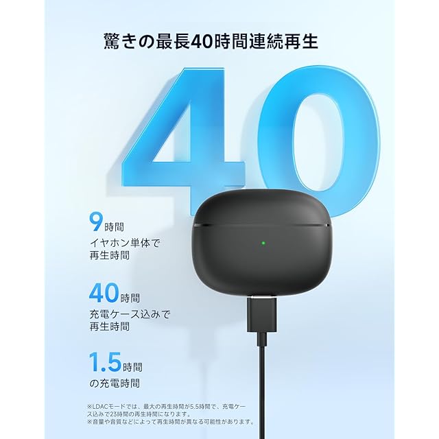 【最大40時間の再生時間】最大40時間の連続再生を実現しています。低消費電力技術と高性能バッテリーを搭載しており、イヤホンがフル充電後、約9時間の連続音楽再生が可能です。充電ケースと合わせると、最大40時間の音楽再生が楽しめます。【アプリで自分好みにカスタマイズできる】強制登録不要、マルチバンドイコライザー、バッテリー表示、カスタマイズ可能なタッチコントロールなど豊富な機能が利用できます。進化されたバージョンでより使いやすくなりました。