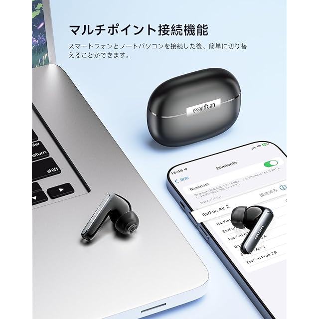 商品名:【VGP 2024金賞】EarFun Air 2 Bluetooth 5.3 ワイヤレスイヤホンハイレゾ LDAC対応/40時間再生/マルチポイント接続/10バンド専用アプリ/55msゲームモード/ワイヤレス充電/ IPX7防水【4マイク通話テクノロジー / PSE認証済み】 ハンズフリー通話 音声アシスト機能 (ブラック)