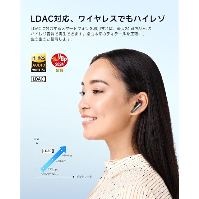 【「VGP2024」金賞受賞、 プロに認められた自信作】EarFun初、高音質コーデック「LDAC」 に対応しました。日本オーディオ協会によるハイレゾ認証も取得しています。CDの約3倍(24bit/96kHz)という情報量、最大990kbpsというビットレートにより、音楽のディテールを生き生きと描写します。ハイレゾ音源本来の音を損ねることなくワイヤレス再生できるEarFun Air2は、音楽を聴く感動を呼び覚まします。注意:LDACモードを利用するために、このコーデックに対応する端末が必要です。iPhoneはLDACモードを利用することはできません。