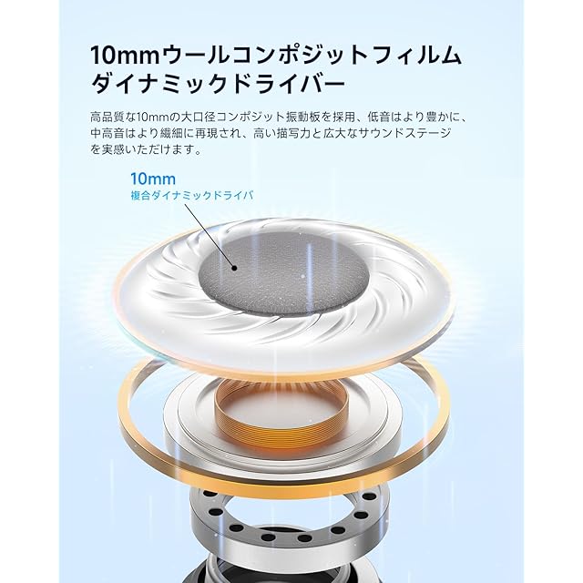 【圧倒的な音質体験】10mm径ウール複合ダイナミックドライバーダイナミックドライバーを搭載し、精緻でバランスの取れた音を楽しめます。クリアなボーカル、力強い低音、伸びやかな高 音がほどよく調和し、奥行きのあるサウンドステージを実現します。【ENC通話ノイズキャンセリング】高感度マイクを左右のイヤホンに各2基/計4基搭載、ENCノイズキャンセリングにより周囲の雑音を取り除いたクリアな通話を実現します。自動車の走行音や風の音など、90%以上の環境音を排除することができます。