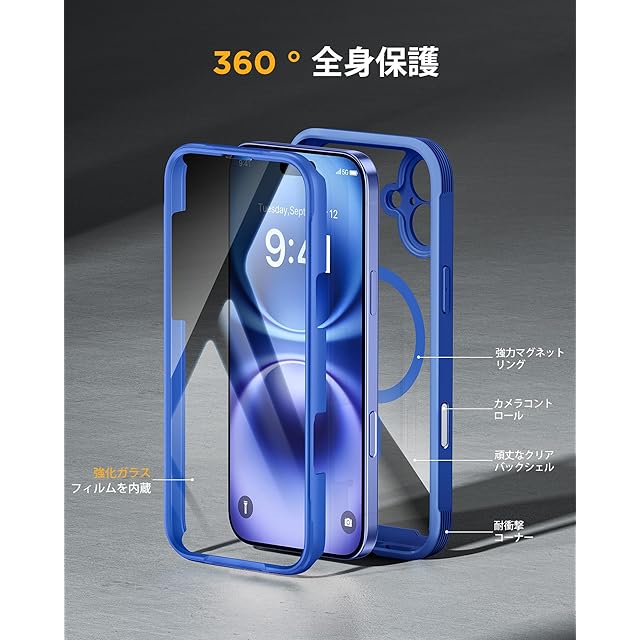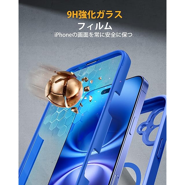 Miracase iPhone16 ケース MagSafe対応 スマホケース いPhone16 用 カバー 9H 強化ガラス 360°保護 全身バンパー保護ケース 6.1インチ フルカバー ワイヤレス充電対応 マグセーフ対応 マグネット搭載 群青 | TREND DESIGN 家電専門店