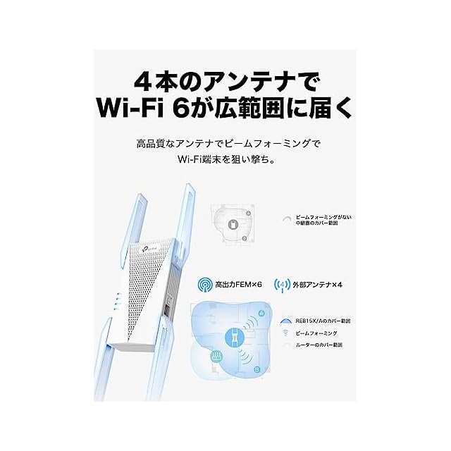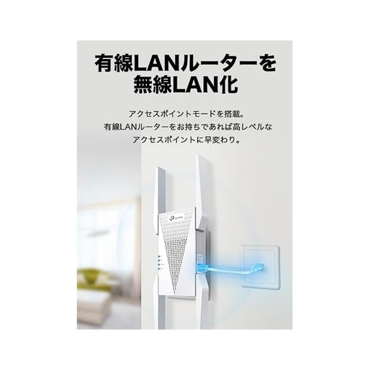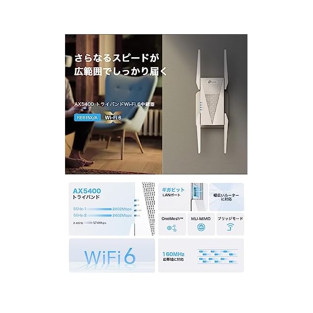 商品名:TP-Link Wi-Fi 無線LAN 中継器 Wi-Fi6 対応 2402Mbps(5Ghz) + 2402Mbps(5GHz) + 574Mbps(2.4GHz) 11ax/ac トライバンド 160MHz スマートローミング OneMesh 対応 かんたん設定 ブリッジモード (APモード) ギガ有線LANポート RE815X/A