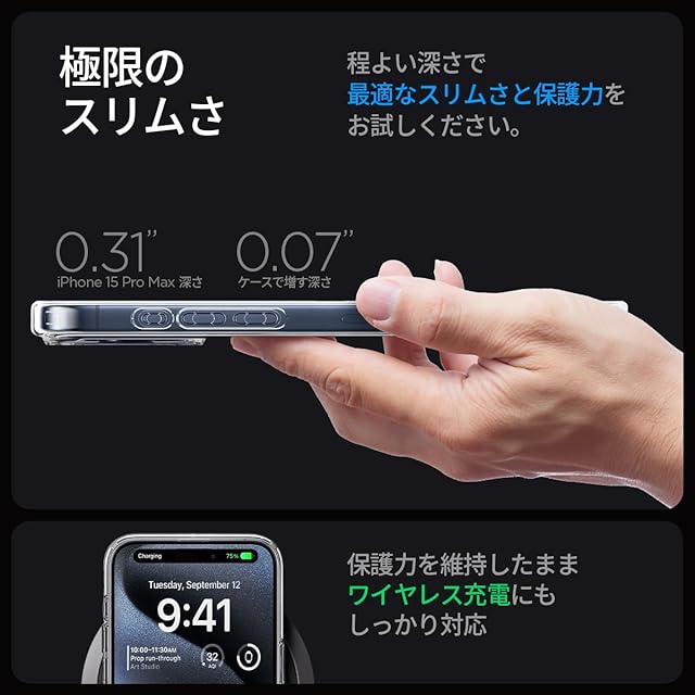 【使用面へこだわった側面】落下時の衝撃を格段と緩衝出来る「エアクッションテクノロジー」を採用、ボタン部はフルカバーデザインでデバイス保護に念入りしました。受話スピーカーには音声が良く聞こえるよう3Dサウンドトンネルで仕上げながら、本体機能でもある「ワイヤレス充電」もケースを装着したまま行えます。