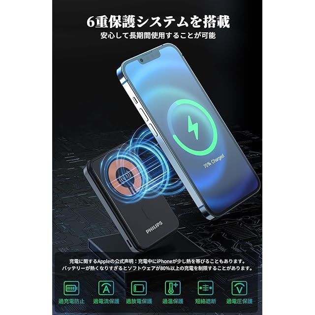 【PHILIPSの安心】高品質なリチウムイオン電池内蔵し、過充電防止、過放電保護、過電圧保護、過電流保護、過温保護、短絡遮断、6重な安全保護システムを装備し、モバイル充電器の安全性と長寿命を確保されています。PSE安全認証済みで、安心な品質もできます。何かご不明な点などございましたらお気軽にお問い合わせくださいませ。