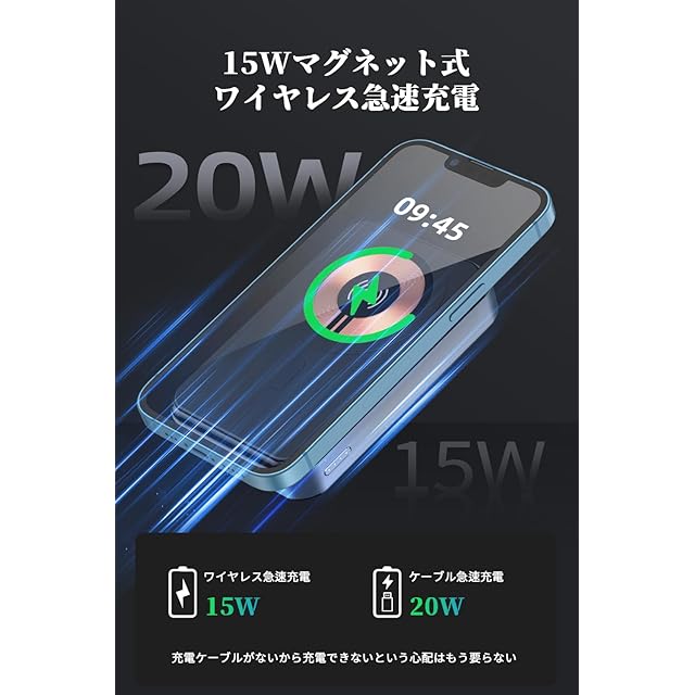 【最大20W急速充電&強い吸着力】MagSafe/Quick Charge充電規格に対応し、ワイヤレス出力(15W)とType-C 出力ポート(QC 20W)の2つの出力方式を備えています。3A出力は、iOSのデバイスだけでなく、Androidのデバイスにも、より速くデバイスを充電することができます。強力な磁気コイルを内蔵し、充電ケーブルを抜く必要がなく、従来のモバイル充電器より便利で、電源の位置を調整する必要がありません。ワイヤレス充電エリアにスマホを置き、電源ボタンを押して充電を開始されます。