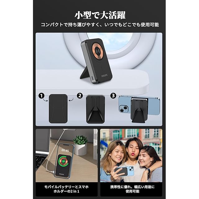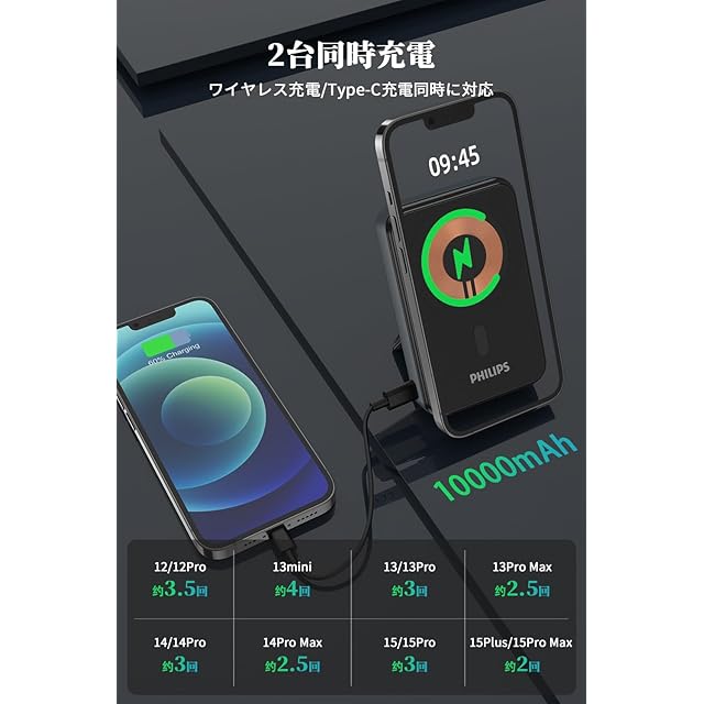 商品名:Philips マグネット式 10000mAh MagSafe ワイヤレスモバイルバッテリー 小型 携帯充電器 大容量 2台同時充電 パススルー機能/入出力USB-Cポート/スタンド付き PSE認証済 機内持込可能 DLP2716QB
