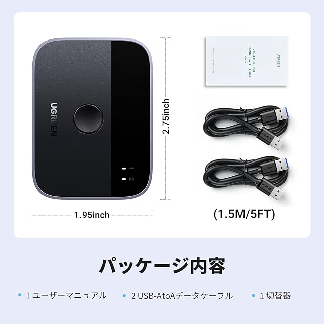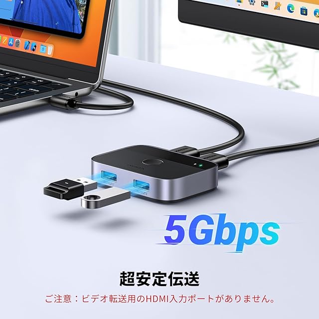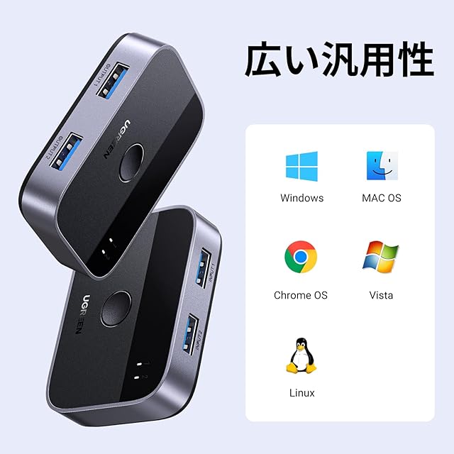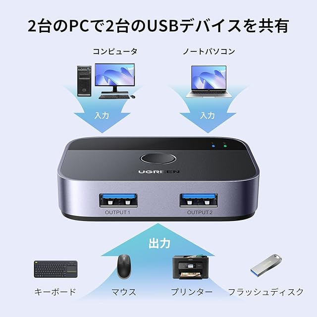 商品名:UGREEN USB3.0切替器 2入力2出力 USB切替機 2PCでキーボード/マウス/プリンタ/スキャナ/Webカメラなどを共有、2台のPC用プリンタ切替機、2*USBポート切り替え機 2本USBケーブル付き