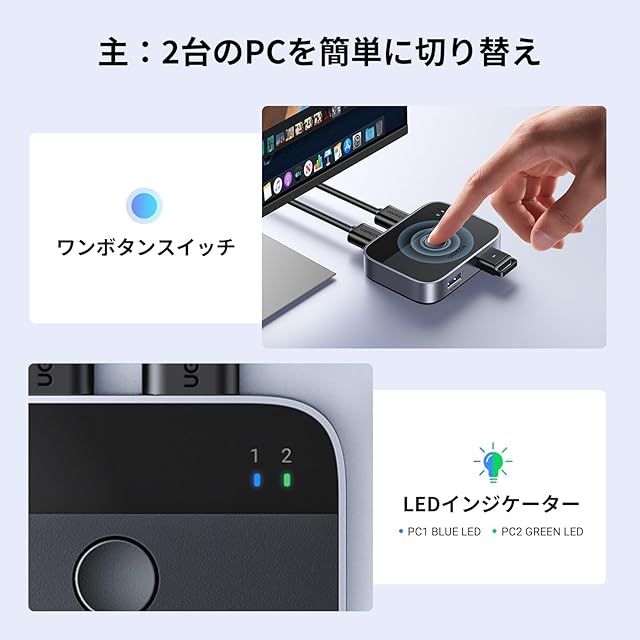 【ワンボタンUSB切替器】: USB切替ボタンとLEDインジケータ設計により、ワンクリックで2台のコンピュータ間で複数のUSBデバイスを自由に切り替えることができ、作業状況を明確に知ることができます。