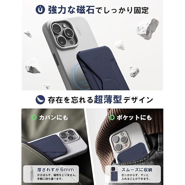【ユニークな磁力の進化!MOFT Snapケースと組み合わせて個性を引き立てる】 MOFT Snapケースと組み合わせることで、この製品は一段と進化します。新しい磁石の採用により、スマホにより強力な磁気でしっかり固定できるのが特長です。この強力な磁力を生かし、ユーザーは自分だけのカラーの組み合わせで個性をアピールすることができます。これによって、単なるスマホスタンドではなく、ユーザーのライフスタイルやスタイルを豊かに彩るアクセサリーとなっています。