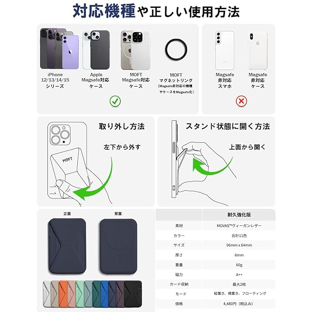 ✅【対応機種と注意事項】iPhone 16/15/14/13/12全シリーズに対応できます。または、MagSafe機能があるスマホケースやマグネットリングと併用することで使用可能です。*MOFT Snapケースと併用すれば、磁力がさらにアップ!