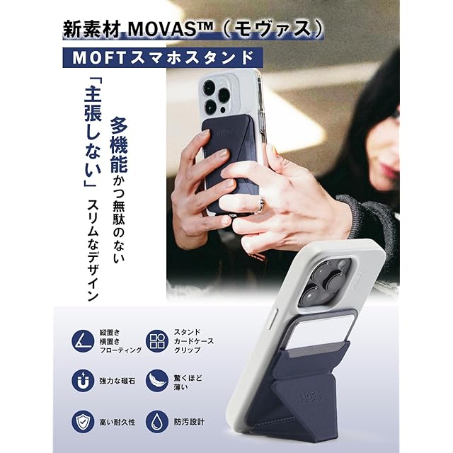 ✨【最新のヴィーガンレザー「MOVAS」採用!洗練されたスリムデザインで高耐久性】 「MOVAS」は、MOFTが誇りを持って開発したヴィーガンレザーで、その特長は一見の価値があります。この素材は驚くほど繊細な手触りを備えながら、同時に高い耐久性を持ち、さらには環境への優しさも追求しています。その結果、この素材を使用したスマホスタンドは、優れた張力と靱性を誇り、ポケットにキーホルダーやカードキーと一緒に収納しても傷がつきにくいのが特長です。洗練されたスリムデザインは、ユーザーに高級感をもたらし、日常のスタイリッシュな使い勝手を追求した結果として、このヴィーガンレザーのスマホスタンドは他と一線を画しています。 【超薄型デザインの便利さを超越!スタイリッシュな展開可能なスマホスタンド】 この製品はスマホスタンドの概念を覆す、超薄型デザインが際立つ一品です。スタンドを畳むことで驚くほどのスリムさを実現し、これにより携帯性が向上。しかしこのスタンドは、単なるスリムさだけではありません。素早く展開してスタンドとして利用することができ、これによってスマホを立てかけたり、動画を見たりする際にも非常に便利です。場所を取らないスマートなデザインは、ユーザーにとって日常生活の中での利便性を最大化します。 【財布いらずの軽快さ!スリムデザインに2枚のカードをスマートに収納】 この製品は財布いらずの新しい生活を提案します。その秘密は、スリムなデザインにありながら、最大2枚のクレジットカードや運転免許証などをスマートに収納できる点です。このスマホスタンドは非常にシンプルでありながら、必要なカードをまとめて持ち歩くことができ、更にはスタンドを展開することで、カードの取り出しも簡単です。外出時の手軽さを求めるユーザーにとって、これはまさに理想的なアクセサリーといえるでしょう。 【MagSafe対応の自在な使い勝手!360度向きを変えるスマホスタンド】 このスマホスタンドは、MagSafe対応機種に対して自在な使い勝手を提供します。マグネット内蔵で、思い通りに向きを切り換えることが可能で、縦置き、横置き、フローティングモードに簡単に切り換えることができます。この自由度の高い機能は、ユーザーが様々なシーンや状況に対応できることを意味し、スマホの使い勝手を飛躍的に向上させます。【ユニークな磁力の進化!MOFT Snapケースと組み合わせて個性を引き立てる】 MOFT Snapケースと組み合わせることで、この製品は一段と進化します。新しい磁石の採用により、スマホにより強力な磁気でしっかり固定できるのが特長です。この強力な磁力を生かし、ユーザーは自分だけのカラーの組み合わせで個性をアピールすることができます。これによって、単なるスマホスタンドではなく、ユーザーのライフスタイルやスタイルを豊かに彩るアクセサリーとなっています。 ✅【対応機種と注意事項】iPhone 15/14/13/12全シリーズに対応できます。または、MagSafe機能があるスマホケースやマグネットリングと併用することで使用可能です。*MOFT Snapケースと併用すれば、磁力がさらにアップ!【安心のアフターサービス】 お客様が商品に関して何かお気づきの点やご不明点がございましたら、どうぞお気軽にご連絡ください。私たちはお客様のご満足を最優先に考え、迅速かつ丁寧に対応させていただきます。注文履歴より弊店までご一報いただければ、専門のアフターサポートが迅速に対応いたします❗ 顧客が何を求めているかを理解し、それを基に確かなサービスを提供することを大前提に、お客様に安心してご利用いただけるよう心がけております。どんな些細なことでも結構ですので、お気軽にお知らせください。お客様のご要望に応じて、より良いご対応ができるよう心待ちにしております。