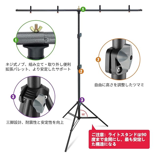 商品名:T字型背景布スタンド ブランド:Hemmotop サイズ:1.5x2m 重量:1.25kg 材質:スチール製 高さ:82-192cm 幅:79-158cm スタンドの管径:25.4/22.2/19/16mm クロスバーの管径:19.1mm パッケージ内容: 三脚スタンドx1 クロスバーx2 リーシブル背景(黒・白)x1 背景布黒x1 強力クリップx5 収納バッグx1