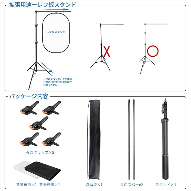 【2-in-1背景スタンド】撮影スタンドだけではなく、レフ板スタンドとしても使え、照明リフレクター、レフ板、背景布などを固定することができます。(ご注意:パイプを1本だけ使用する場合、力学に基づき、バランスを取れるために、三脚の足の置いた方向に注意する必要があります。詳しく図2でご参考ください。)パッケージ内容:T字型背景スタンドx1、リバーシブル背景(黒・白)x1、強力クリップx5。パッケージ重量:約2.2㎏。