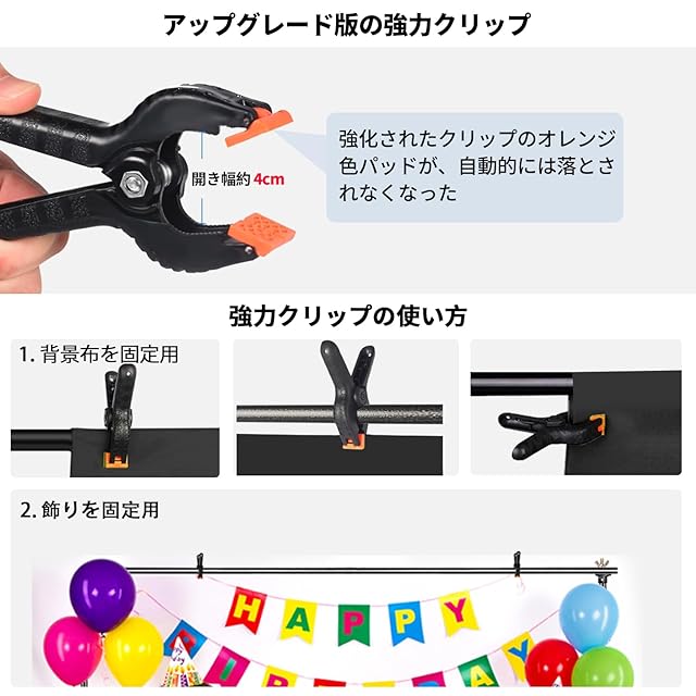【設置や片付けが楽】本背景布スタンドは組み立てや分解は非常に簡単で、手間が掛からないです。軽量の設計で軽くて簡単に持ち運べ、付属のキャリーケースでコンパクトに収納できます。あまりベースを占用しなく、撮影スタジオや屋外で幅広く使用されます。また、5個の強力クリップが付き、背景シートや背景紙などしっかりと撮影スタンドに固定可能です。