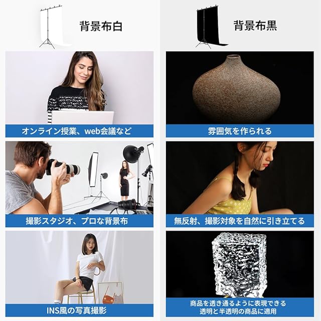 【無反射の撮影背景布】白と黒の背景布は無駄な光の反射を防ぎ、光沢感を抑え、撮影対象を自然に引き立てることができます。レーザ切断技術を採用することで、背景布全体がより滑らかになり、美しい仕上がりの実現できます。白い布は急に決まった web会議 、部屋の汚れがお掃除せずに迅速に使用可能です。そして椅子やテーブルに巻きつけたり、ゴツゴツした壁の表面やロケーションに合わせセッティングが可能で、INS風の写真撮影にも対応可能です。黒い背景布は広告商品・赤ちゃん写真・成人のポートレートなどのスタジオ&アウトドア撮影に大活躍です。