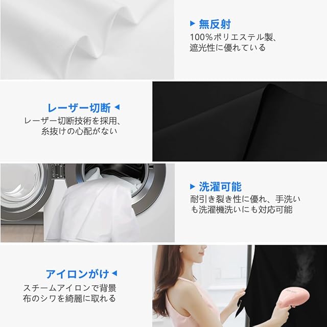 【使用便利】背景布は折り畳んでお届けることで、しわがあり、スチームアイロンをかけてしわが取れます。ご注意:普通の電気アイロンも使えますが、ポリエステル用(低温)までご設定ください。また、背景布は100%ポリエステル材質です。汚れる場合、手洗いも洗濯機も対応可能です。洗濯後、平に干すことをお勧めいたします。