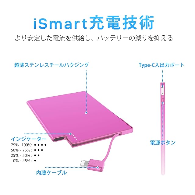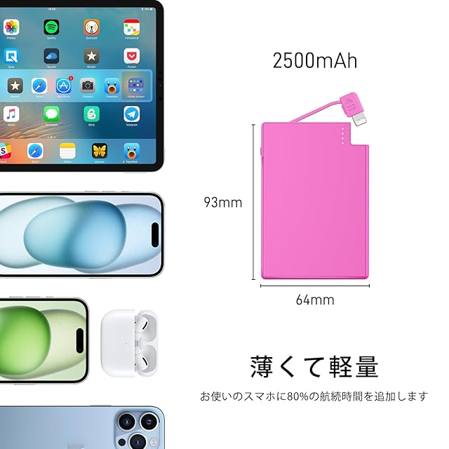 TNTOR ミニ 超薄型 モバイルバッテリー iPhone 14/13/12対応 Lightningケーブル内蔵 わずか4.5mm 軽量小型 MFi認証 ポータブルバッテリー 2500mAh 充電コード内蔵 専用充電器 持ち運び便利 【PSE認証済】バービーピンク色 | TREND DESIGN 家電専門店
