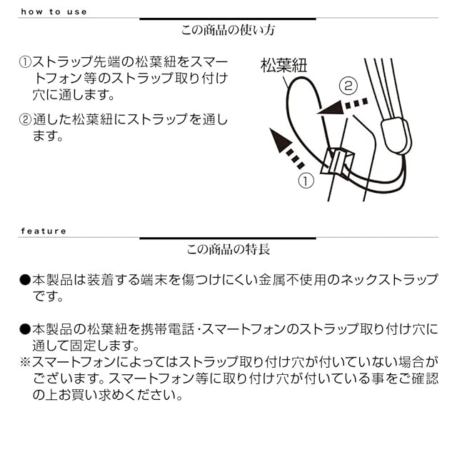 本製品は装着する端末を傷つけにくい金属不使用のネックストラップです。 本製品の松葉紐を携帯電話・スマートフォンのストラップ取り付け穴に通して固定します。 ※スマートフォンによってはストラップ取り付け穴が付いていない場合がございます。 スマートフォン等に取り付け穴が付いている事をご確認の上お買い求めください。 本製品を取り付けた状態で振り回したり、強く引っ張ったりしないでください。 製品及び機器の破損や故障、ケガの原因となります。 ※ご使用のモニター環境により、実際の商品の色合いと多少異なってみえる場合がございますのでご了承ください。