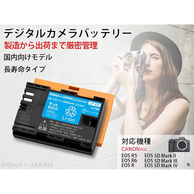 ■対応機種 <BR>◆CANON対応 キヤノン対応 <BR>EOS R5 <BR>EOS R6 <BR>EOS R6 Mark II <BR>EOS R7 <BR>EOS R <BR>EOS Ra <BR>EOS 5D Mark II <BR>EOS 5D Mark III <BR>EOS 5D Mark IV <BR>EOS 5D Mark2 <BR>EOS 5DS <BR>EOS 5DS R <BR>EOS 60D <BR>EOS 60Da <BR>EOS 6D <BR>EOS 6D Mark II <BR>EOS 70D <BR>EOS 7D <BR>EOS 7D Mark II <BR>EOS 80D <BR>EOS 90D <BR> <BR>※カメラ本体で充電できません <BR> <BR>◆Blackmagic Design対応 ブラックマジックデザイン対応 <BR>Blackmagic Pocket Cinema Camera 4K <BR>Blackmagic Pocket Cinema Camera 6K <BR>BMPCC 4K <BR>BMPCC 6K <BR> <BR>■バッテリーグリップ <BR>◆CANON対応 キヤノン対応 <BR>BG-E6 <BR>BG-E7 <BR>BG-E9 <BR>BG-E11 <BR>BG-E13 <BR>BG-E14 <BR>BG-E16 <BR>BG-E20 <BR>BG-E21 <BR> <BR>◆Blackmagic Design対応 ブラックマジックデザイン対応 <BR>CINECAMPOCHDXBT <BR> <BR>■対応充電器 <BR>◆CANON対応 キヤノン対応 <BR>LC-E6 <BR>LC-E6E <BR> <BR>■互換型番 <BR>◆CANON対応 キヤノン対応 <BR>LP-E6 <BR>LP-E6N <BR>LP-E6NH <BR> <BR>■電圧:7.2V <BR>■容量:2040mAh <BR>■小型インテリジェントリチウムイオンバッテリー <BR>■本体でのバッテリー残量表示対応できます。 <BR>■純正の充電器で充電できます。 <BR> <BR>■純正品ではございません