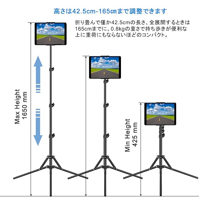 【高さ調整可能】高さは42.5cm-165㎝まで調整できます。録画、撮影、コンサート、講演、読書、オフィスミーティング、ZOOM会議など、様々なニーズに満足できます。