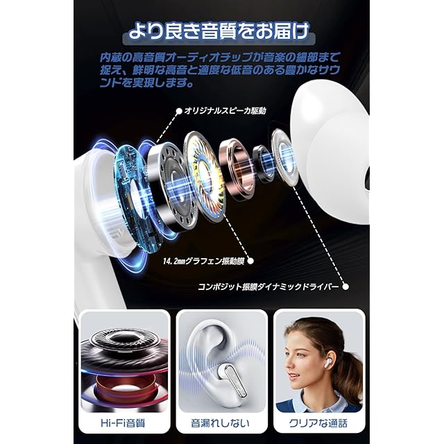 【Hi-Fi音質・音漏れを抑え・CVC8.0対応のクリアな通話】この耳を塞がないイヤホンは大口径ドライバー搭載により、しっかりと低音域から、透明感ある高音域まで聴かせてくれます。AAC/SBCコーデックが揃え、音質をより一層高めて、音の粒も感じれるほどクリアで耳に届けることができます。カナル型イヤホン従来の優れた遮音性により、CVC8.0+ENCノイズキャンセリングも組み込まれているため、ノイズ低減効果を実現、街の喧噪や交通機関による騒音、風の音などの環境音を90%以上除去し、出先・屋内どちらでも高い没入感のある体験を得ることができます。快適なリスニング環境を実現するノイズキャンセリング イヤホンです。また、このbluetooth イヤホン マイク付きで、通話時に使用者の周囲のノイズを排除して、相手が使用者の音声をクリアで大きく聞き取れます。ZOOM、ビジネス、オンライン会議においても大活躍!