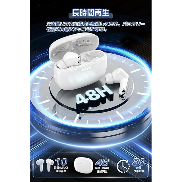 【先端な指紋タッチを採用・左右分離・長連続再生】このイヤフォンは先端な指紋タッチを採用し、ワンタッチで音楽再生/一時停止、通話応答/終了/拒否などの操作をすべて実現可能です。左右分離型で、いつでもどこでも主従を問わず両耳でも片耳でも使用可能です。Type-C急速充電に対応していて、約1.5時間でフル充電できます。LEDディスプレイが搭載されており、バッテリー残量を確認できるため、充電状況が一目でわかります。フル充電でイヤホン単体は10時間の連続再生が可能で、日中、途切れずに音楽を楽しむことが可能です。付属の充電ケースを使えば48時間の使用が可能です。長時間のWeb会議やオンライン授業の際も安心です。