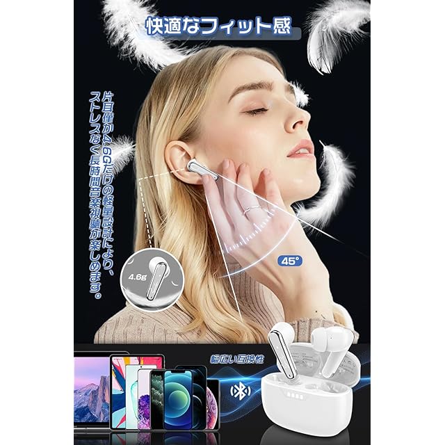 【極上のフィット感・IPX7防水規格・優れた互換性】片耳がわずか約4.6gほどしかない軽量イヤホンはカナル型を採用し、一日中快適に過ごせるフィット感と高い遮音性を両立させています。3点で支える独自の装着方法で、開放感と安定性を両立します。また、この無線イヤホンの防水性能はIPX7ということで汗や雨に強い設計になっています。移動中のゲリラ豪雨、ジョギング中の汗など多少濡れてしまっても気にせず使える安心感があります。ジョギング、ランニング、ヨガ、スポーツ、ジム、サイクリングなどの使用も相性抜群。スポーツ イヤホンとしても最適です。ブルートゥース スマホ イヤホンは優れた交換性を持ち、iPhoneやAndroidに対応しており、ほとんどのスマートフォン、コンピューター、ラップトップ、スマートウォッチなどと幅広く互換性があります。