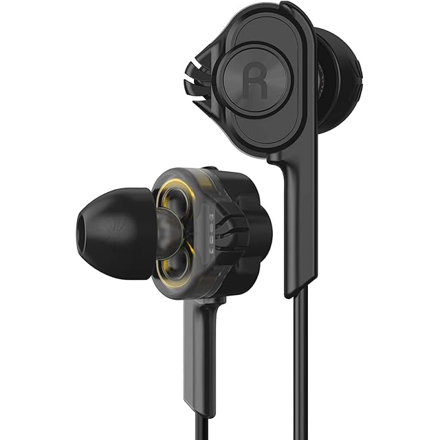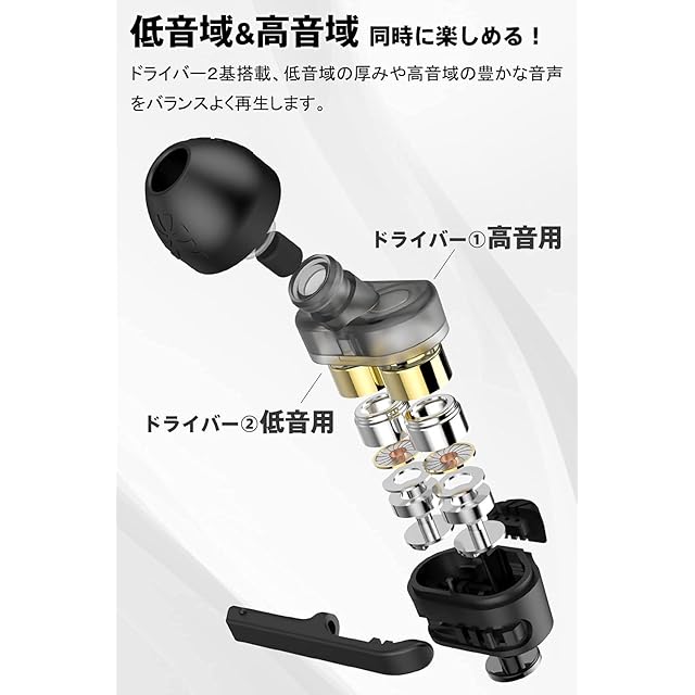 [デュアルドライバー構造] ドライバーは計4つで、左右それぞれに高音域用と低音域用のドライバーを一つずつ備えています。この設計により、イヤホンの高・中・低三音域のバランスが良く、一般的なイヤフォンでは20kHz程度である高音域周波数を40kHzまで拡張します。強力な低音域ドライバーによって迫力ある低音が楽しめるとともに、高音域の細部も逃すことはありません。