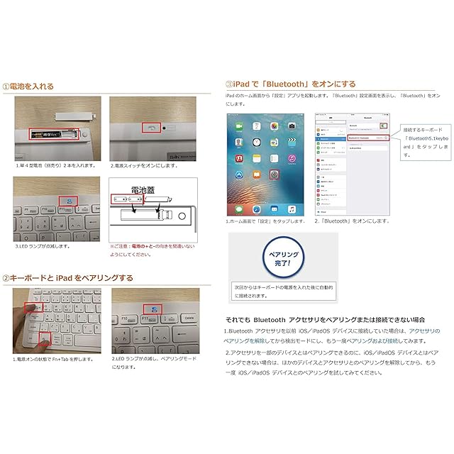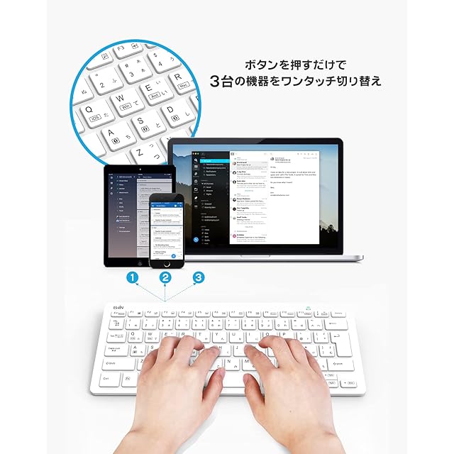 【最大3台のマルチペアリングに対応&Bluetooth5.1規格】在宅ワーク リモート 在宅勤務に適用! パソコンやタブレット、スマートフォンなど、最大3台までのデバイスをペアリング可能です。 ワンタッチで使用機器を切り替えることができるマルチペアリング機能付きです。 Bluetoothに対応したパソコンやタブレットであれば、レシーバ無しで接続できます。 専用ドライバなどのインストールは不要で、ペアリングするだけですぐに使用可能です。 iPadシリーズ、iPhoneシリーズに対応したBluetoothキーボードです。