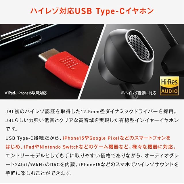 商品名:JBL TUNE 305C 有線インイヤーイヤホン ハイレゾ 96 kHz/24 bits プリセットEQ USB Type-C 12.5mmダイナミックドライバー オープンタイプイヤホン マイク内蔵 フラットケーブル (ホワイト)