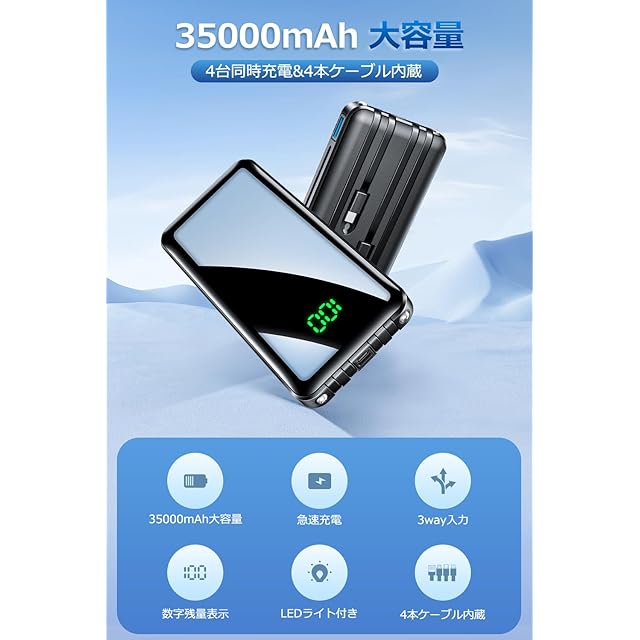商品名:モバイルバッテリー 大容量【35000mAh・4台同時充電】 モバイルバッテリー 軽量 小型 4本ケーブル内蔵 急速充電 LCD残量表示 LED照明ライ Type-C入力ポート USB-A出力ポート 携帯充電器 スマホ 充電器 3WAY入力 iPhone/Android/iPadに適合する PSE技術適合品 旅行/出張/緊急防災 (ブラック)