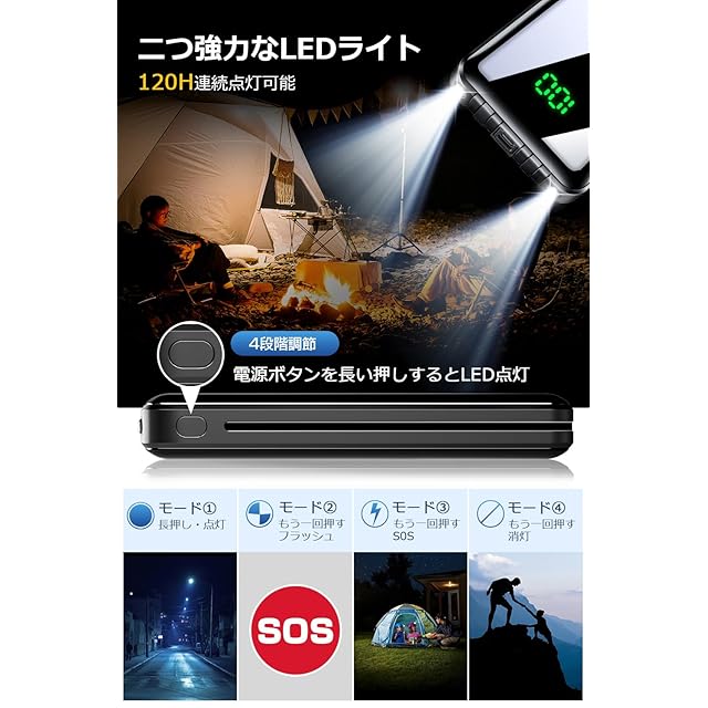 【LCD残量表示 & ライト機能付き】LCD液晶ディスプレイを備えており、バッテリーの残量を1%単位で正確に表示され、充電のタイミングもより掴みやすくて便利です。充電が開始すると、LCDパネルの蓄電量数字は少しずつ増え、100%まで表示すると充電完了。または、LED懐中電灯としても利用でき、非常時の電源や照明としても利用できる。フル充電の場合は、最大120時間持続点灯してキャンプや災害だけでなく、散歩や夜道を歩くのにも使える。父・母の日のプレゼントにも最適です。