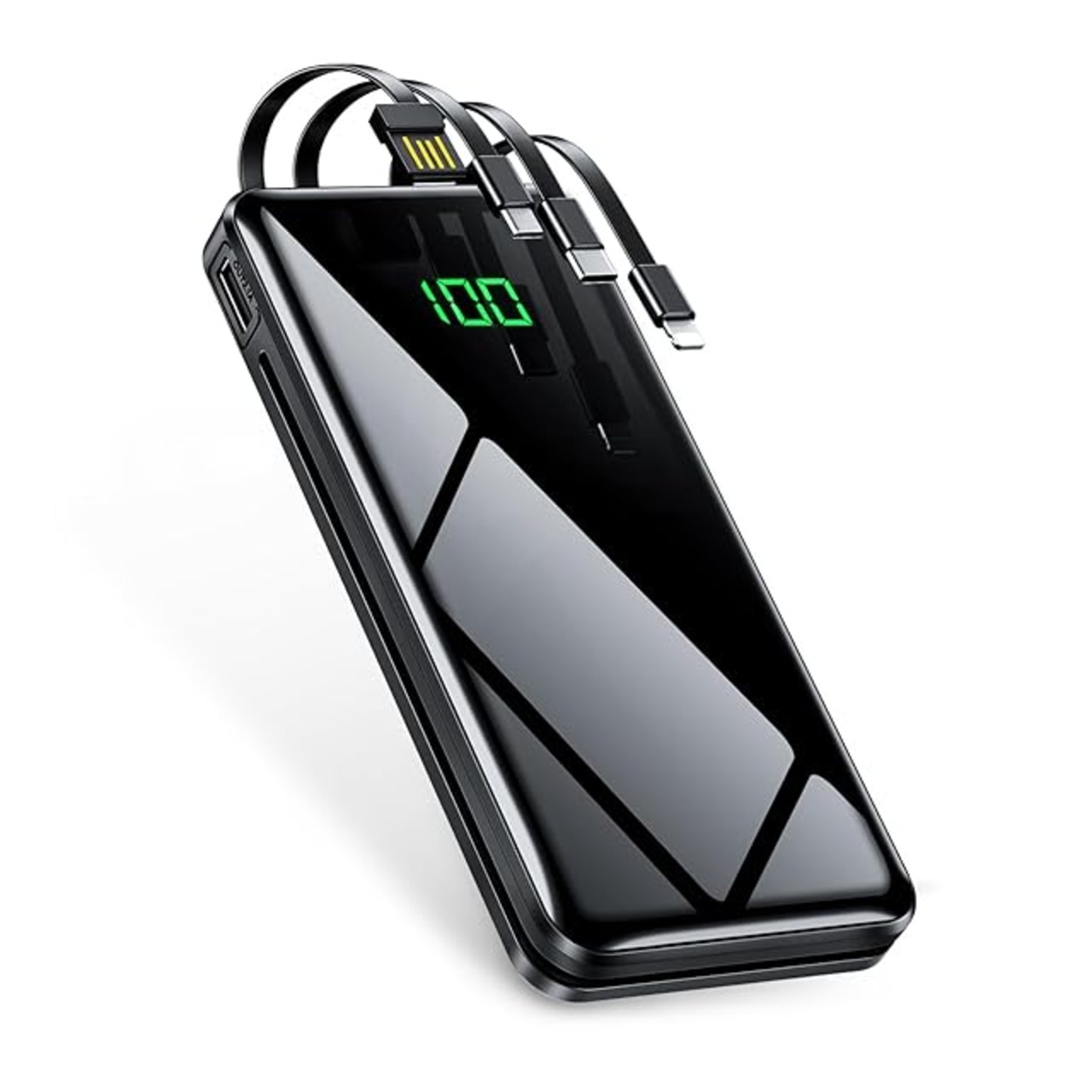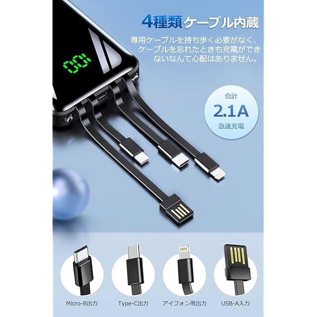 【4in1・4種類のケーブル内蔵モバイルバッテリー】出力にはmicroUSB、USB type-Cなど3規格出力ケーブルが内蔵された最新型のケーブル内蔵モバイルバッテリーです。専用ケーブルを持ち歩く必要がなく、各種タイプのデバイスにも対応出来ます。ケーブルを忘れたときも充電ができないなんて心配はいりません。更に、モバイルバッテリーの本体に充電ケーブルが内蔵されているため、コンセントのある場所であれば即時充電が可能です。