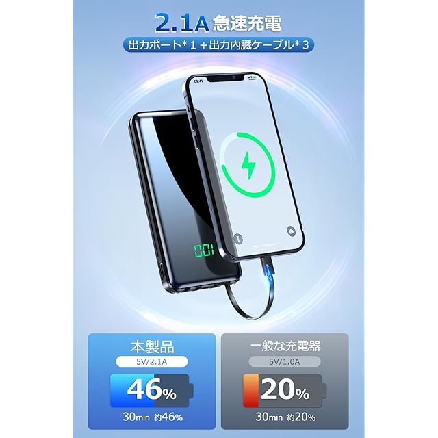 【4台同時充電可能 & 急速充電対応】モバイルバッテリーの出力にはUSB-A ポートと3規格のケーブル内蔵で4台同時に充電可能です。入力にもUSB-CとMicro-USBの2つ選択肢があり、お持ち運びが便利になります。独自のスマート機能によりデバイスを自動で判別し、最適な出力で急速充電を行います。出入力とも最大2.1A急速充電可能ですから、素早く蓄電可能、より長持ちで旅先やちょっとした外出、出張の際の強い味方に最適。