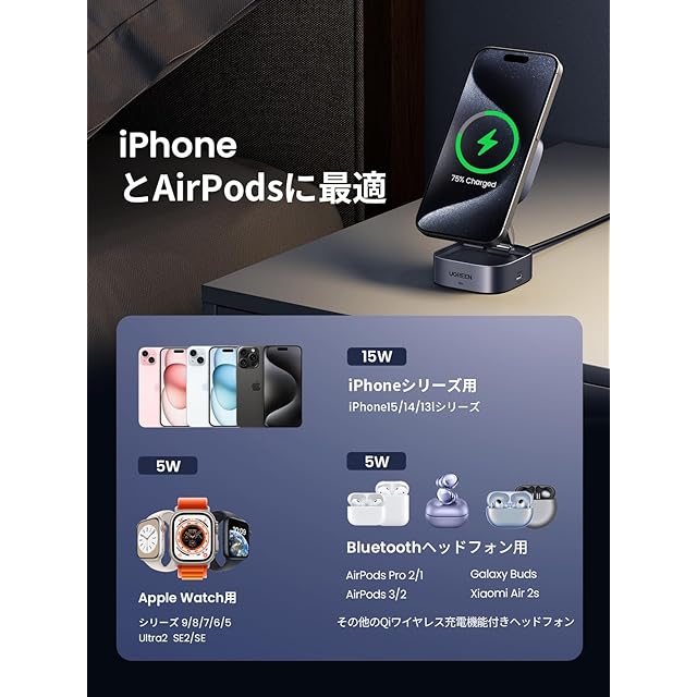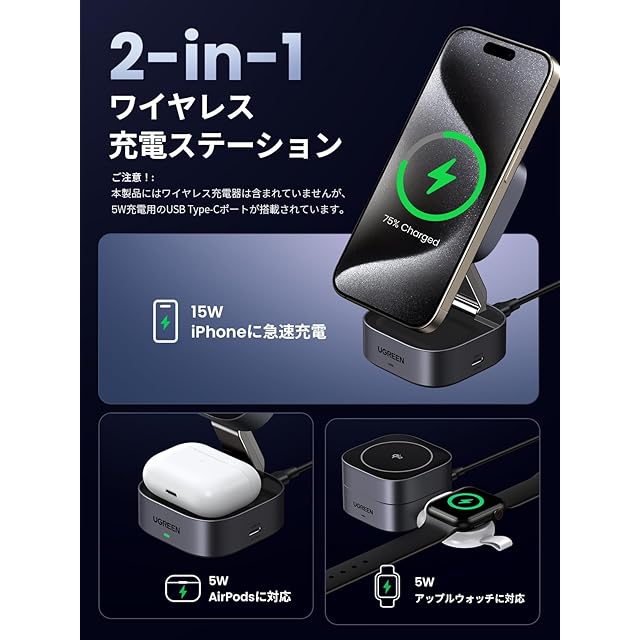 商品名:UGREEN MagFlow Qi2 ワイヤレス充電器 15w magsafe対応 折りたたみ式 マグセーフ 充電スタンド【 2IN1+2*USB Cポート】 iPhone 16/16 Plus/15/14/13/12 シリーズ、AirPods 3/2など
